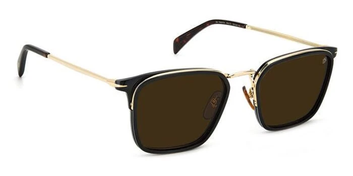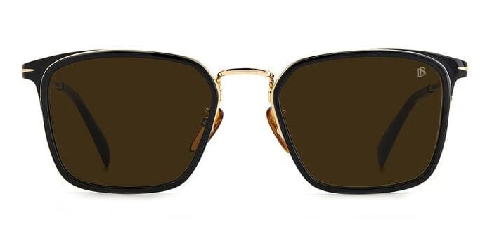 This rectangular David Beckham sunglass comes in a gold and black frame with brown lenses.