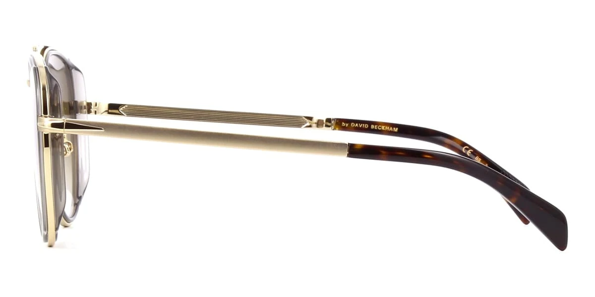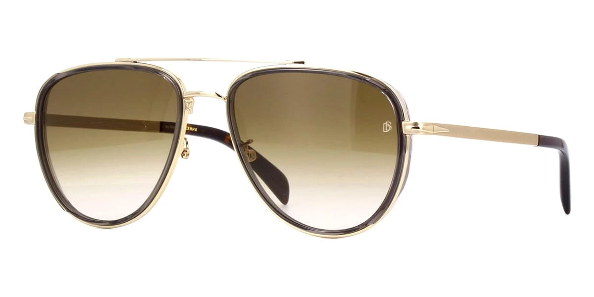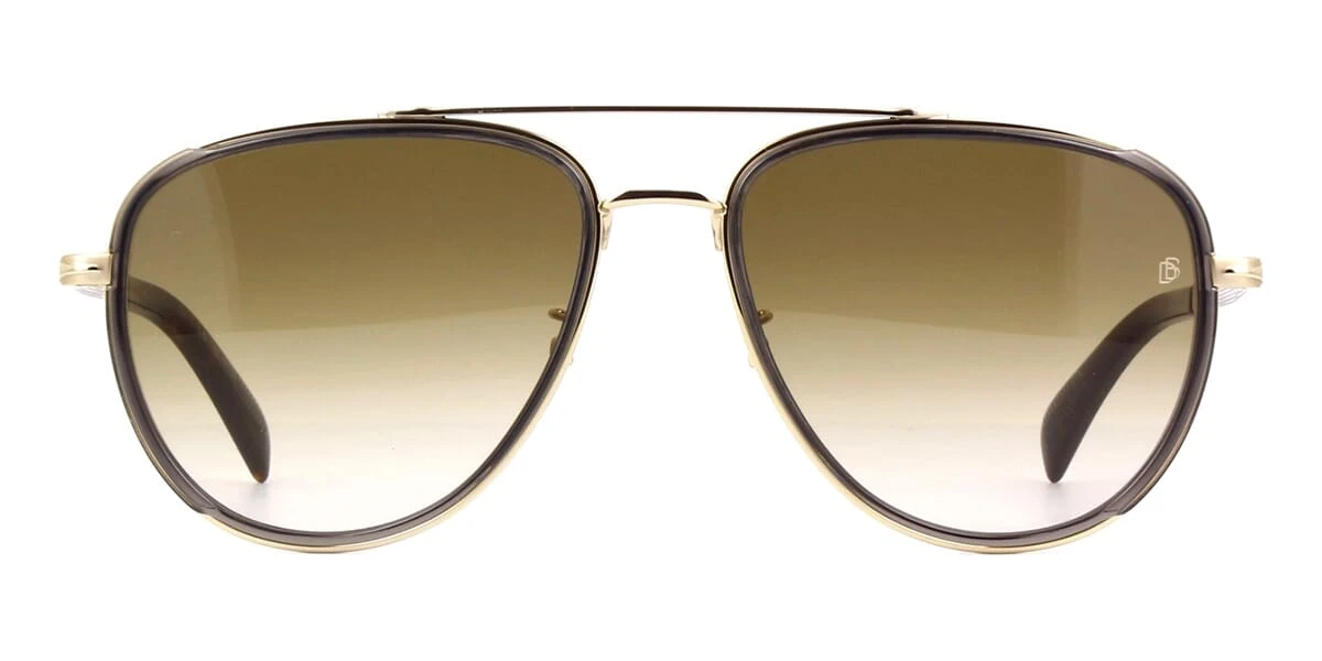 This aviator David Beckham sunglass comes in a gold and grey crystal frame with brown gradient lenses.