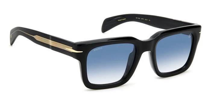 This square David Beckham sunglass comes in a black and gold frame with blue gradient lenses.