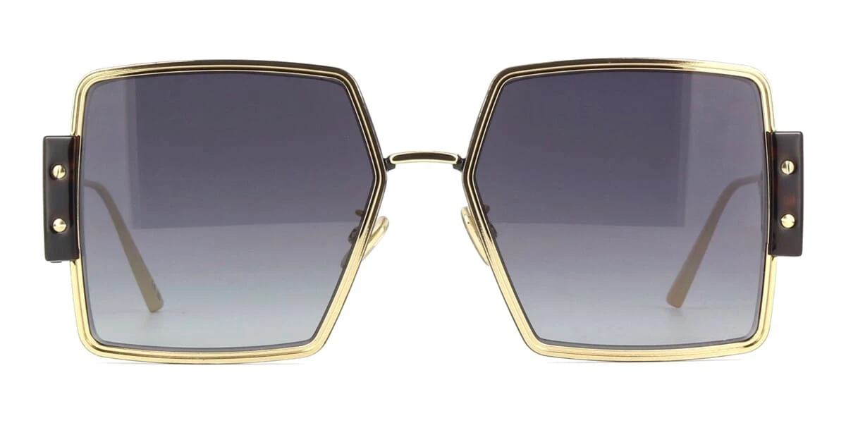 This square Dior sunglass comes in a shiny gold with havana frame with grey gradient with light mirror lenses.