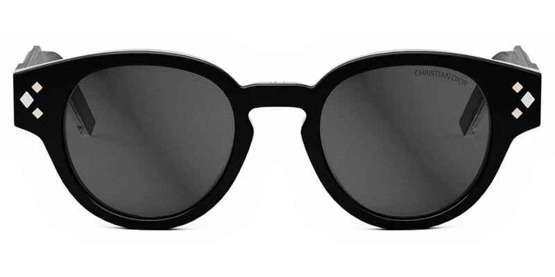 This round Dior sunglass comes in a shiny black with silver frame with grey lenses.