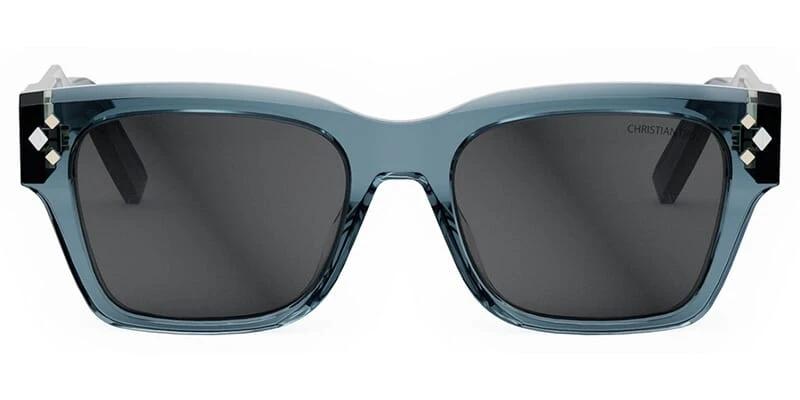 This square Dior sunglass comes in a shiny blue crystal frame with grey lenses.