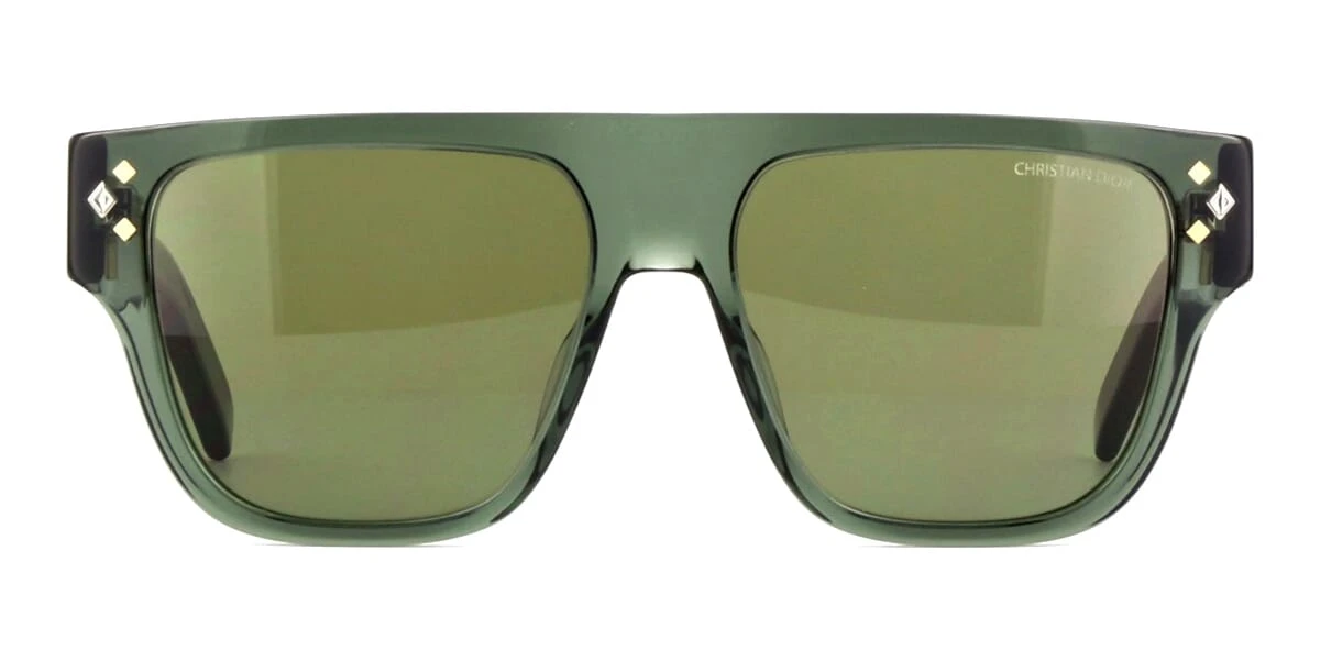 This square Dior sunglass comes in a green crystal frame with green with light mirror lenses.