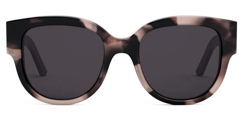 This round Dior sunglass comes in a shiny pink havana frame with grey lenses.