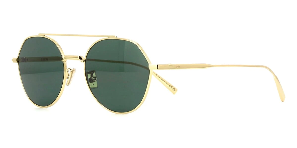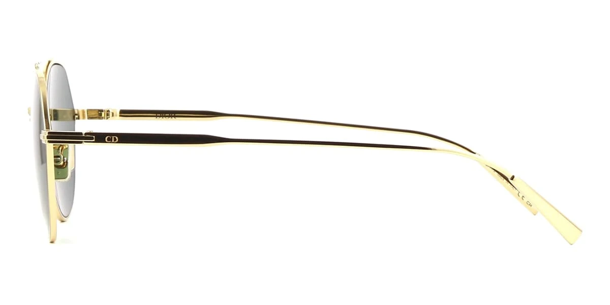 This round Dior sunglass comes in a shiny gold frame with green with light mirror lenses.