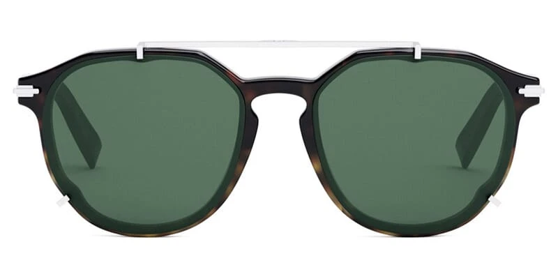 This square Dior sunglass comes in a shiny havana with silver frame with green lenses.