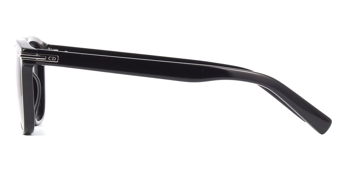 This square Dior sunglass comes in a shiny black frame with dark grey smoke lenses.
