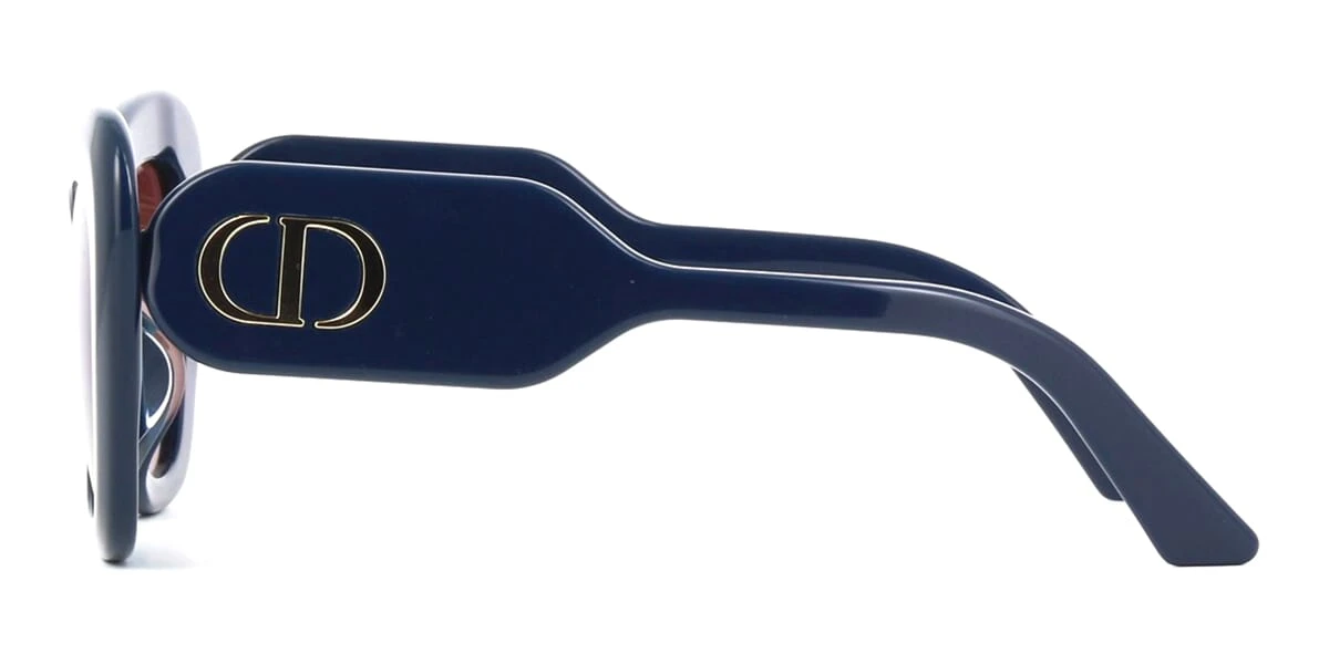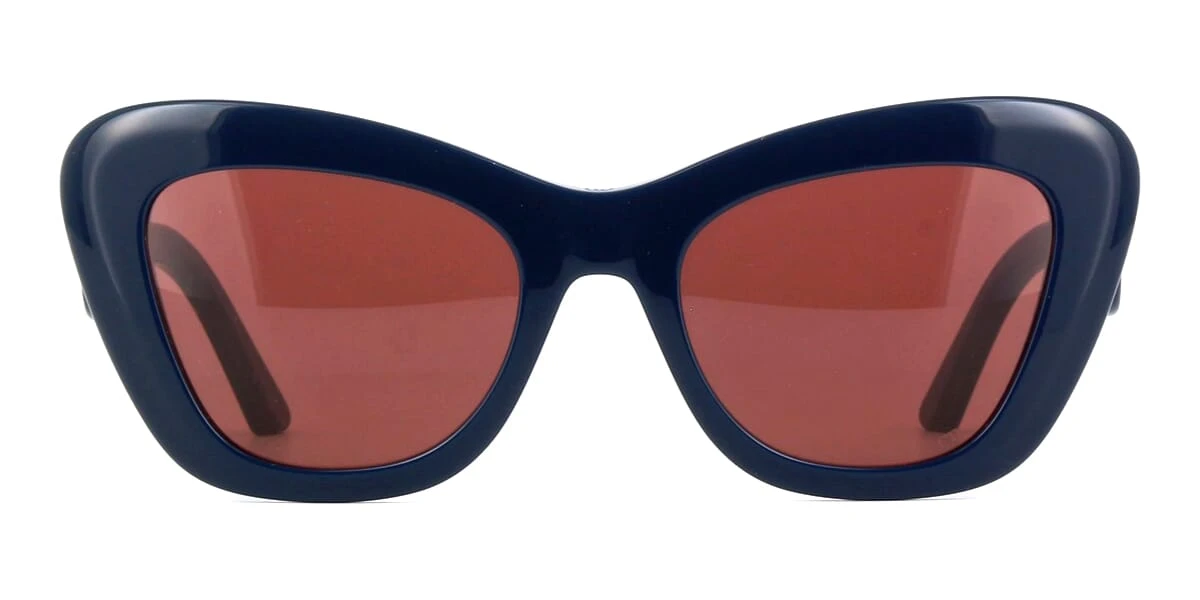 This cat eye Dior sunglass comes in a navy blue frame with red lenses.