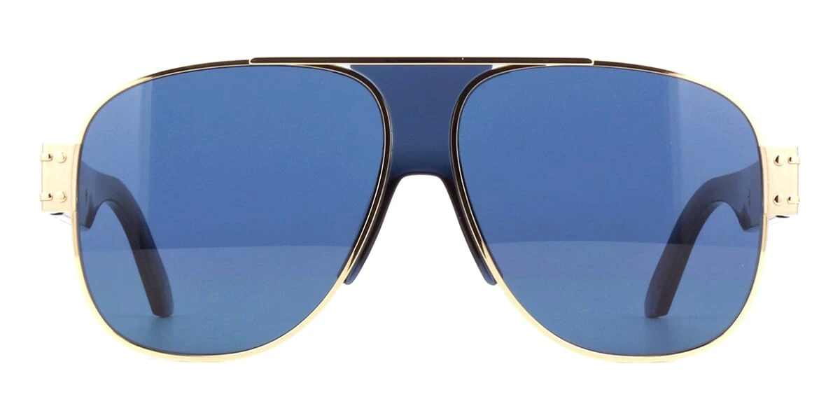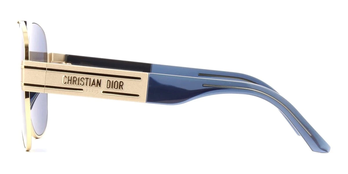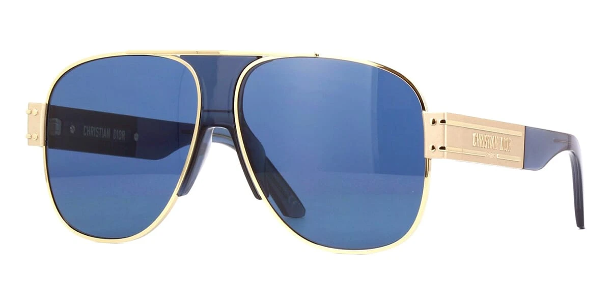 This aviator Dior sunglass comes in a gold with dark blue crystal frame with blue lenses.