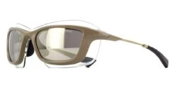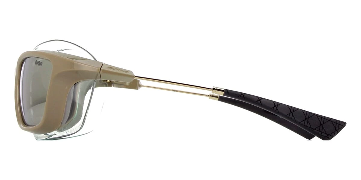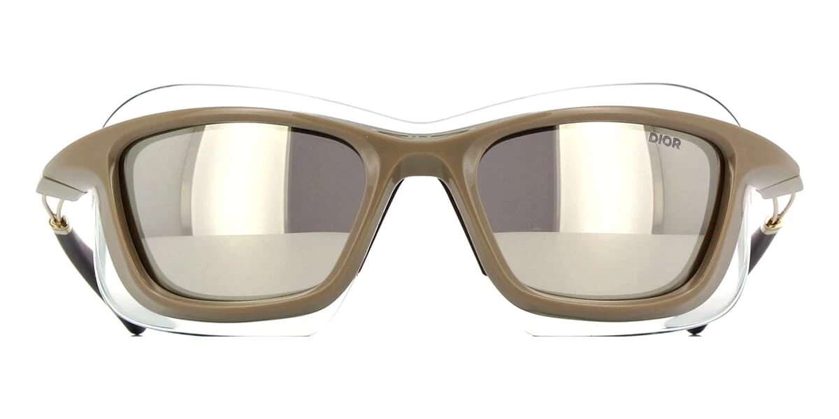 This wraparound Dior sunglass comes in a shiny khaki frame with grey with silver flash mirror lenses.