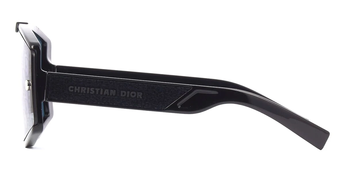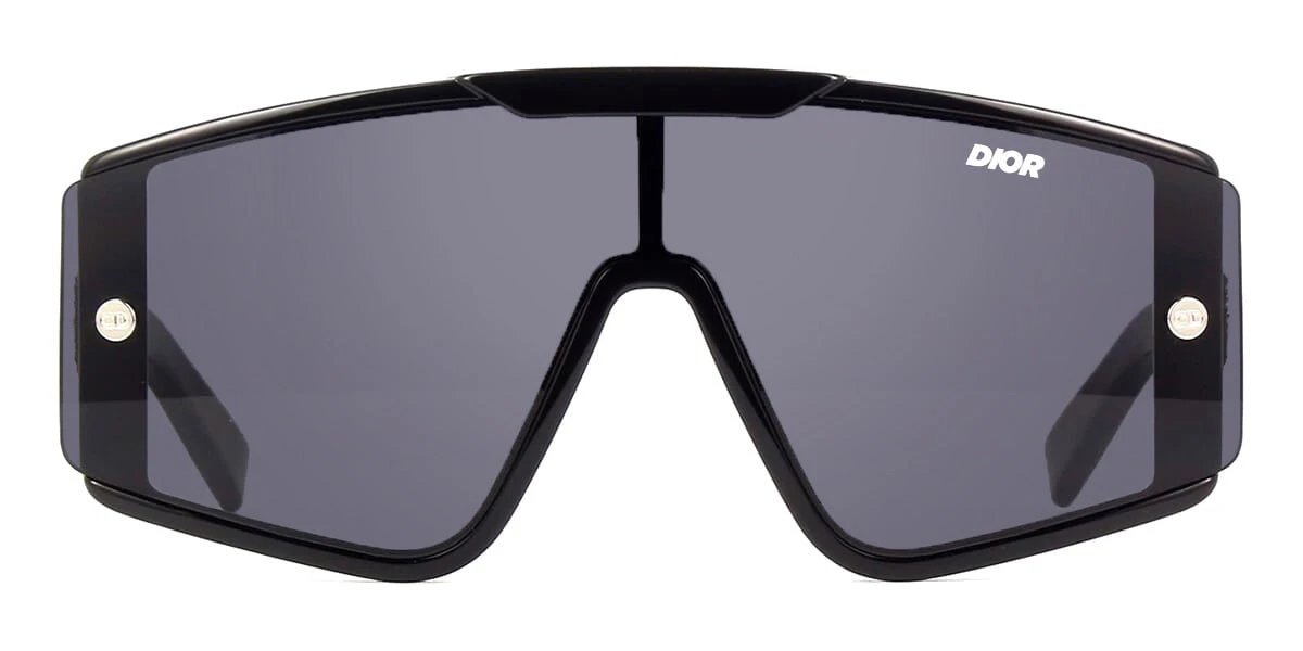 This shield Dior sunglass comes in a shiny black frame with blue with silver dioroblique logo mirror and dark grey magnetic interchangeable lenses.