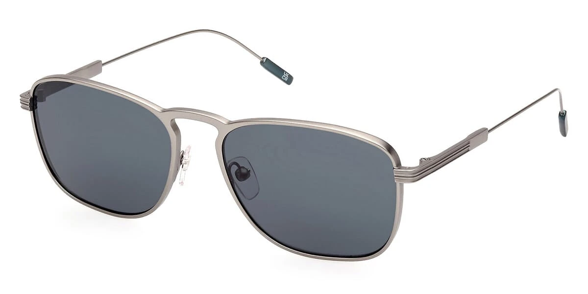 This square Ermenegildo Zegna sunglass comes in a shiny light ruthenium frame with blue lenses.