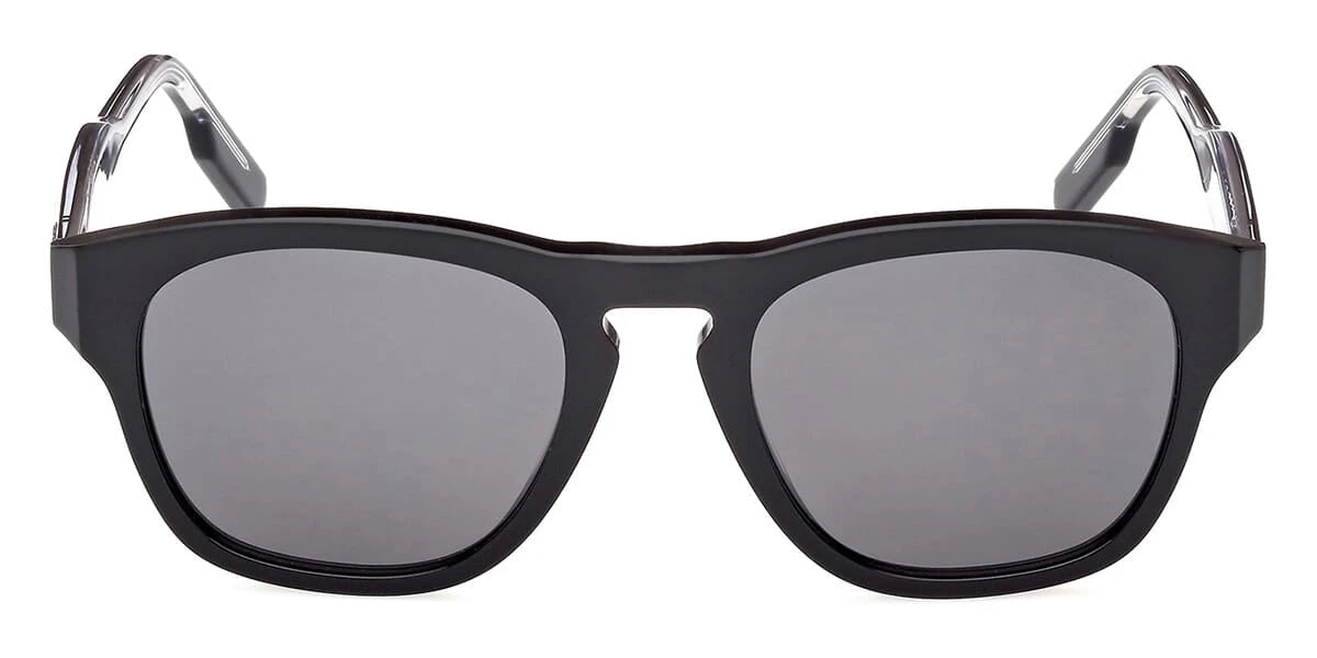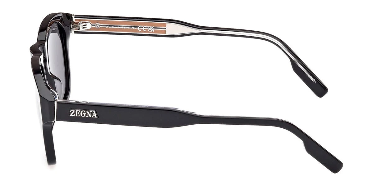 This square Ermenegildo Zegna sunglass comes in a shiny black frame with smoke lenses.