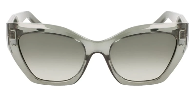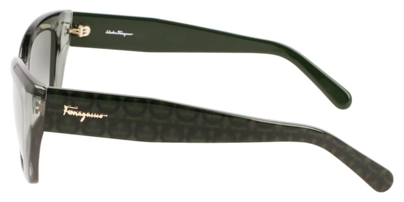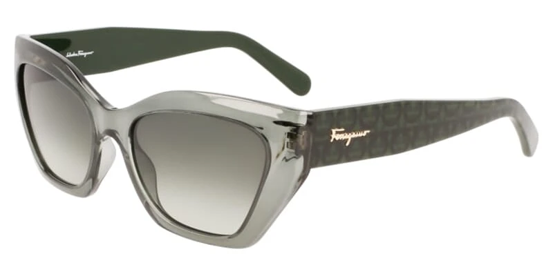 This cat eye Salvatore Ferragamo sunglass comes in a transparent forest green frame with green lenses.