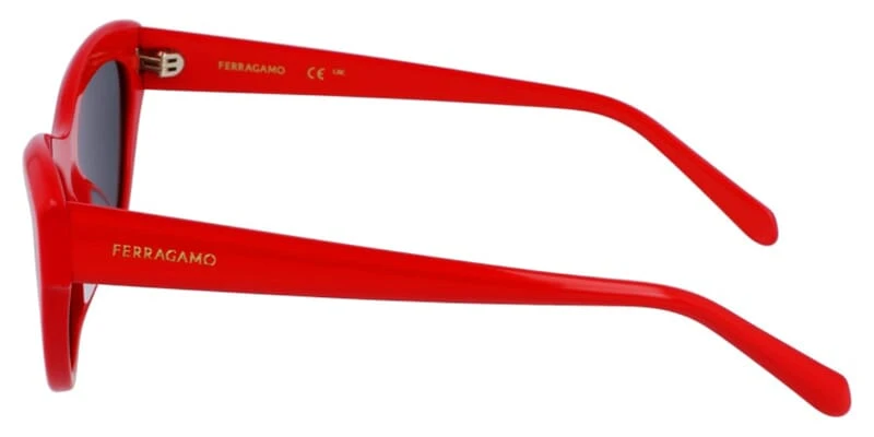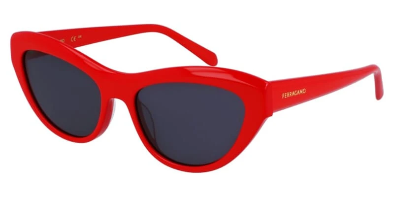 This cat eye Salvatore Ferragamo sunglass comes in a red frame with grey lenses.