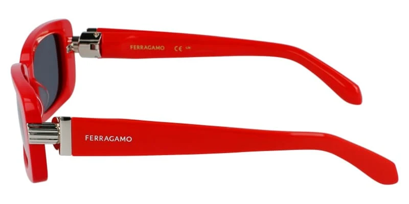 This rectangular Salvatore Ferragamo sunglass comes in a red frame with grey lenses.
