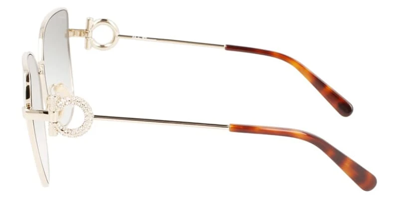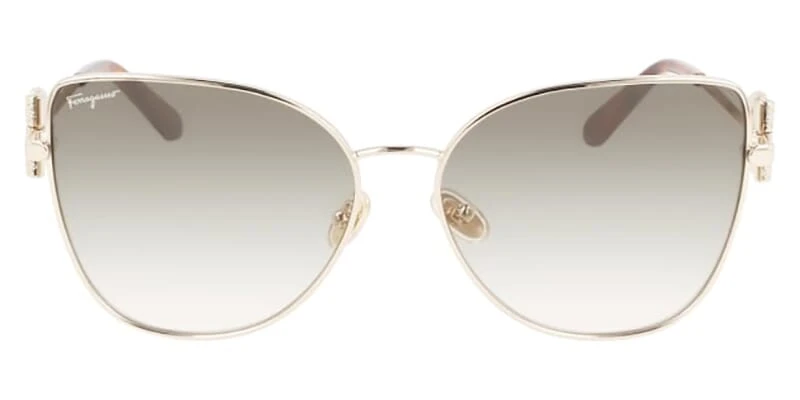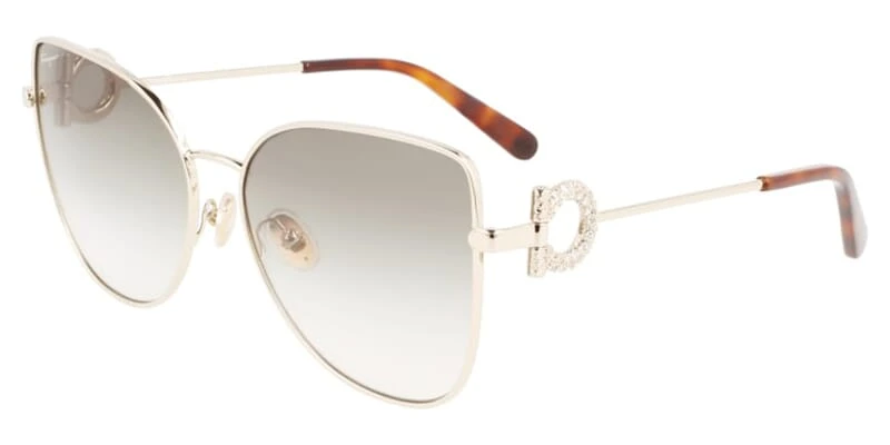 This cat eye Salvatore Ferragamo sunglass comes in a gold frame with green gradient lenses.