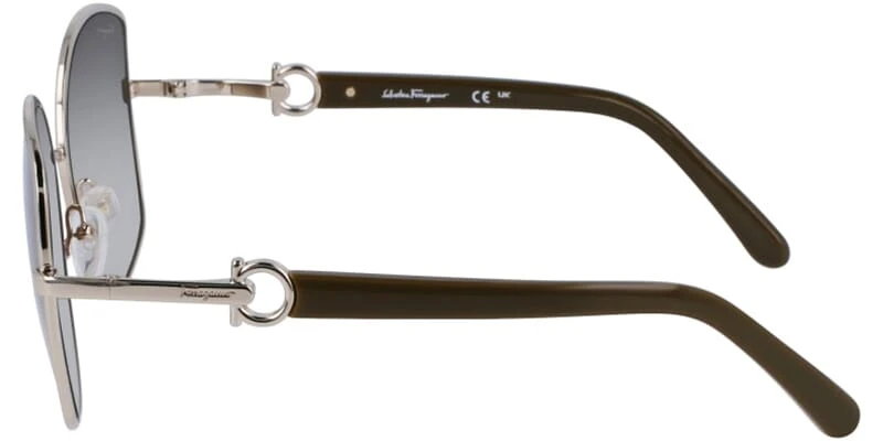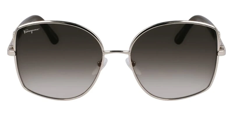This butterfly Salvatore Ferragamo sunglass comes in a gold and khaki frame with grey gradient lenses.