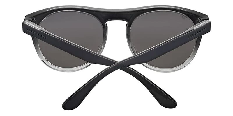 This square Serengeti sunglass comes in a shiny black to clear frame with saturn polarized smoke cat 2 to 3 b4 lenses.