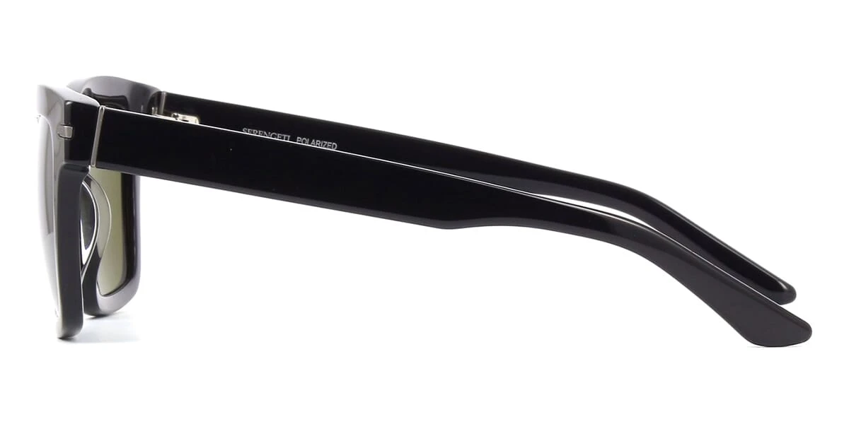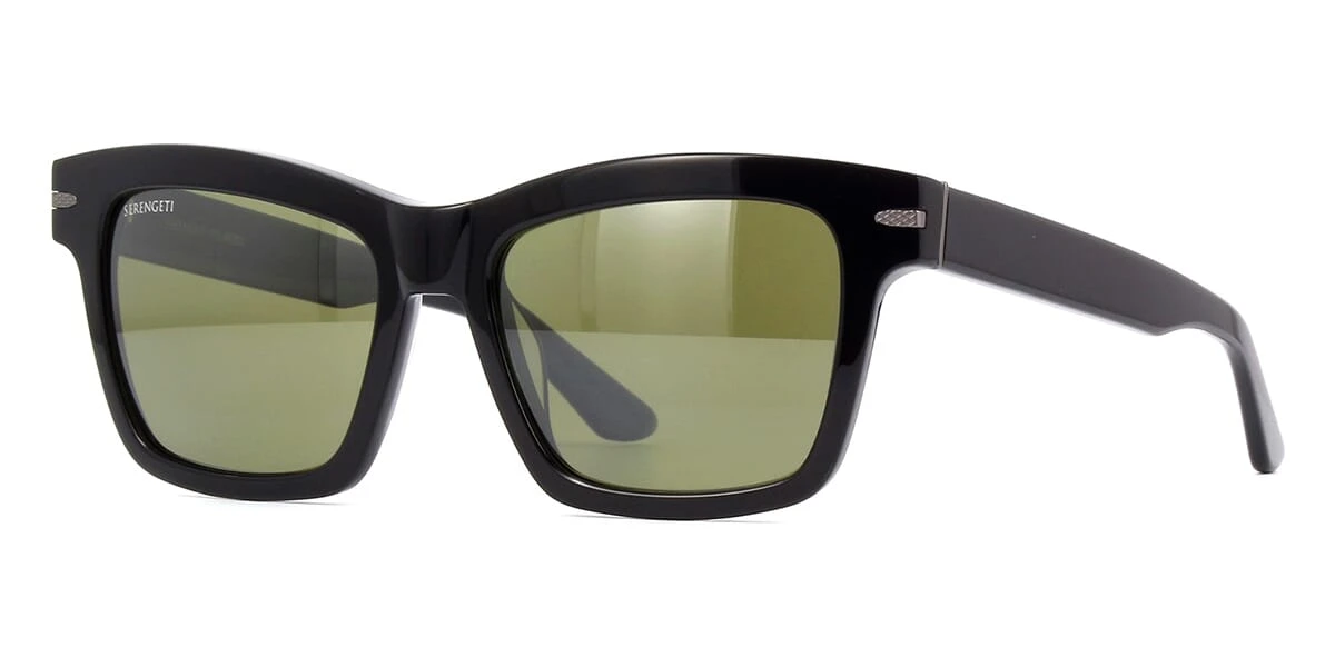 This square Serengeti sunglass comes in a shiny black frame with green with silver flash spectral control photochromic polarised mineral lenses.