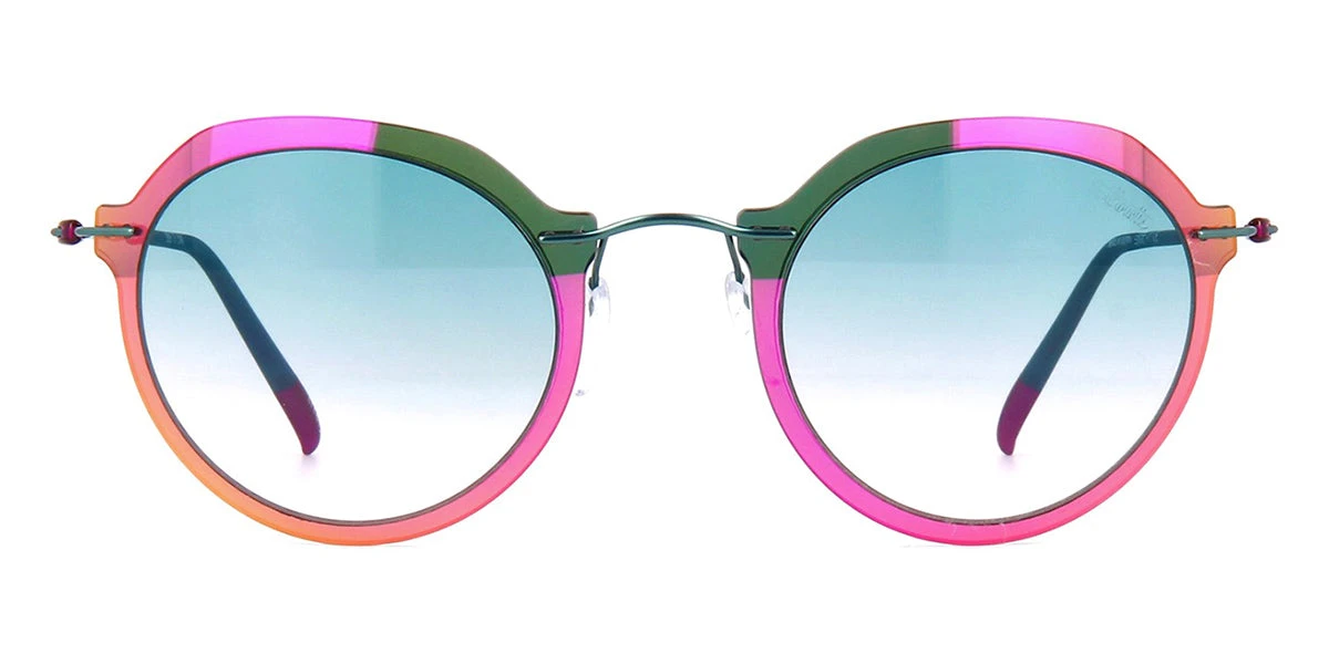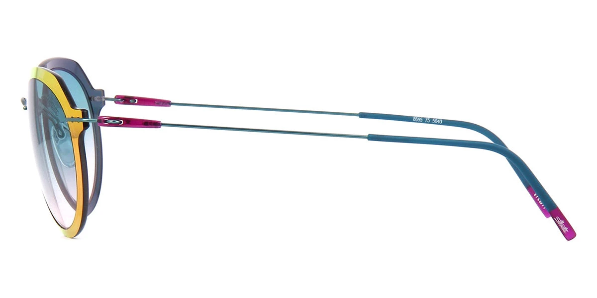 This round Silhouette sunglass comes in a metallic blue with pink multi flash frame with blue gradient lenses.