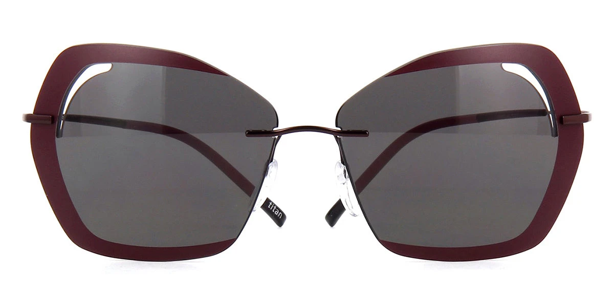 This butterfly Silhouette sunglass comes in a burgundy with purple and pink frame with grey lenses.