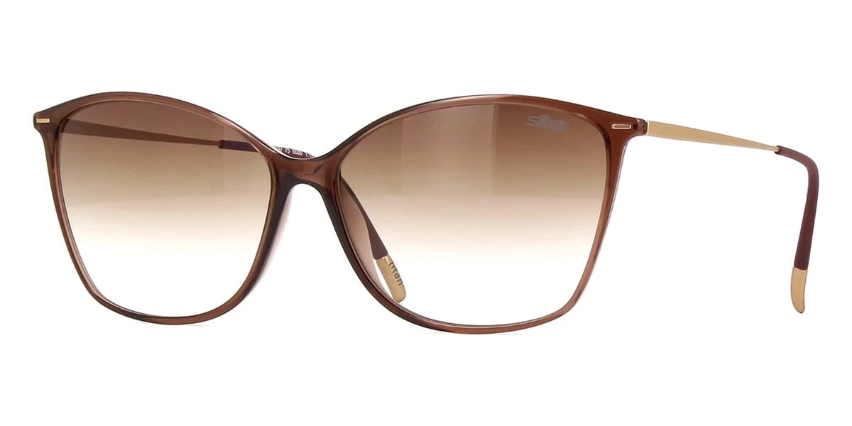 This cat eye Silhouette sunglass comes in a brown crystal and satin gold frame with brown gradient lenses.