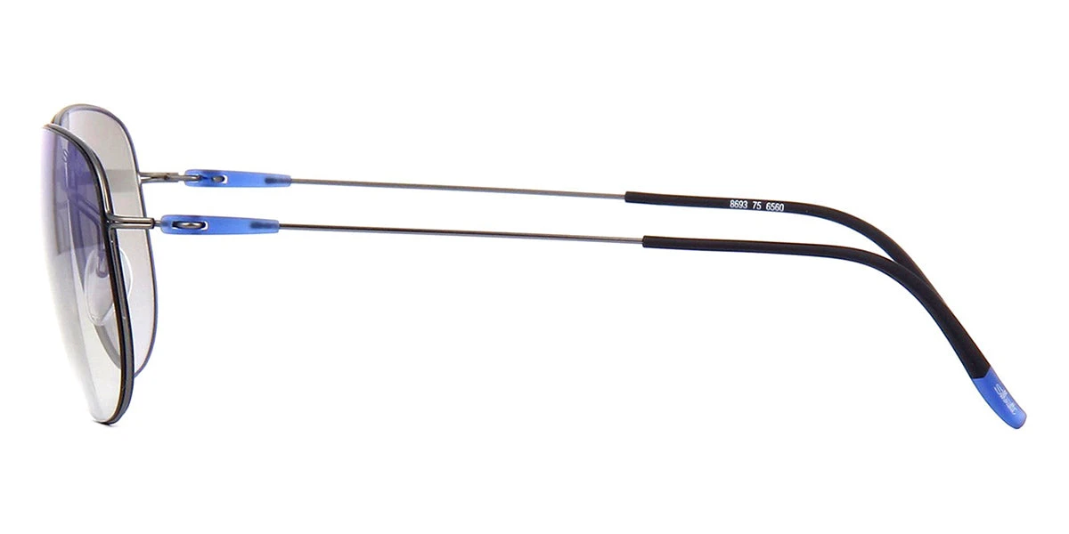 This aviator Silhouette sunglass comes in a matte gunmetal frame with brown gradient with blue to gold gradient flash mirror lenses.