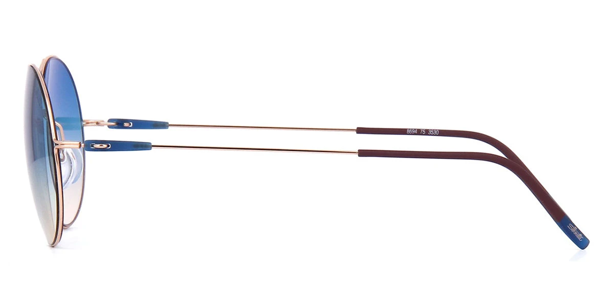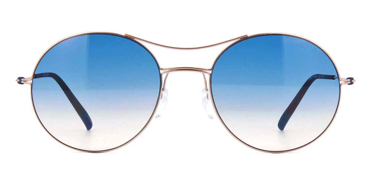 This round Silhouette sunglass comes in a gold frame with blue to sand gradient lenses.