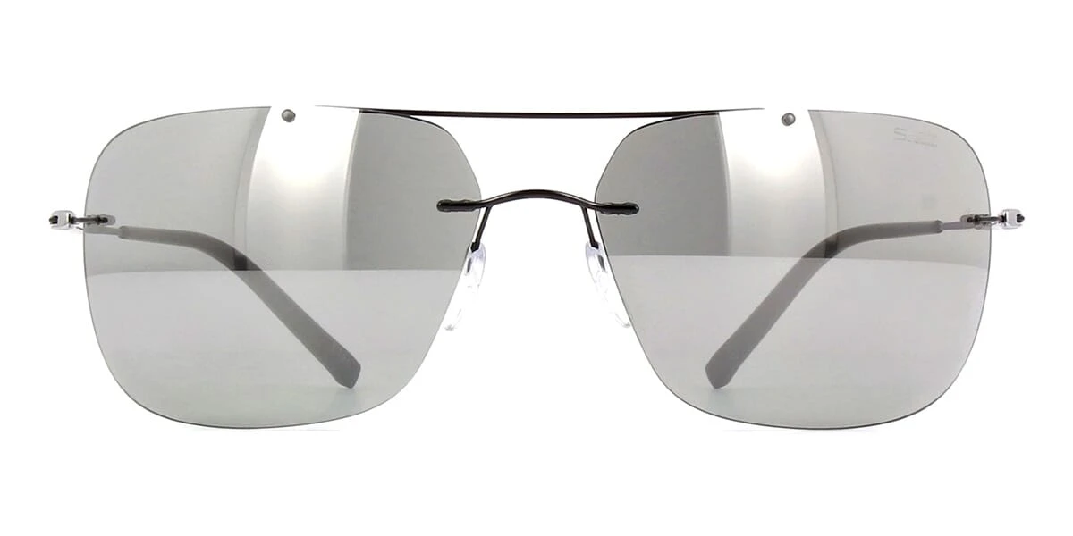 This square Silhouette sunglass comes in a black and silver frame with light grey with silver mirror lenses.