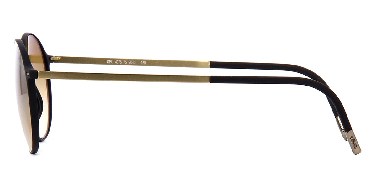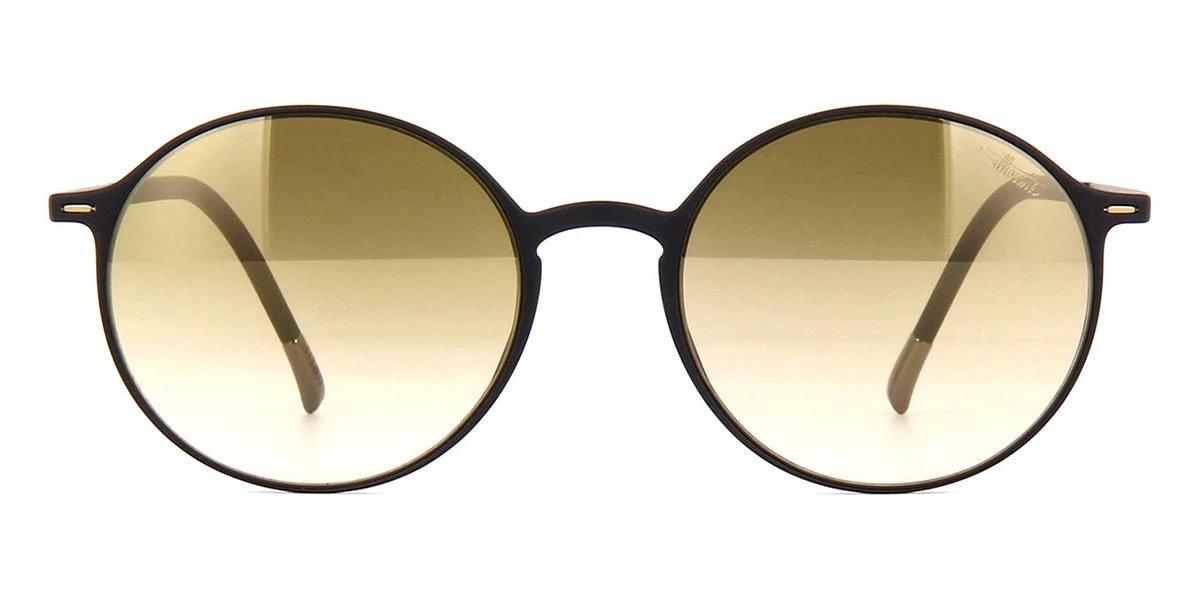 This round Silhouette sunglass comes in a black and matte gold frame with yellow gradient with gold mirror lenses.