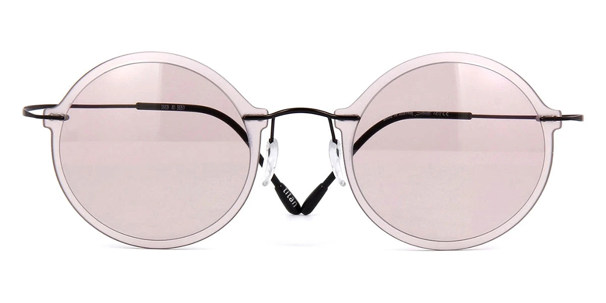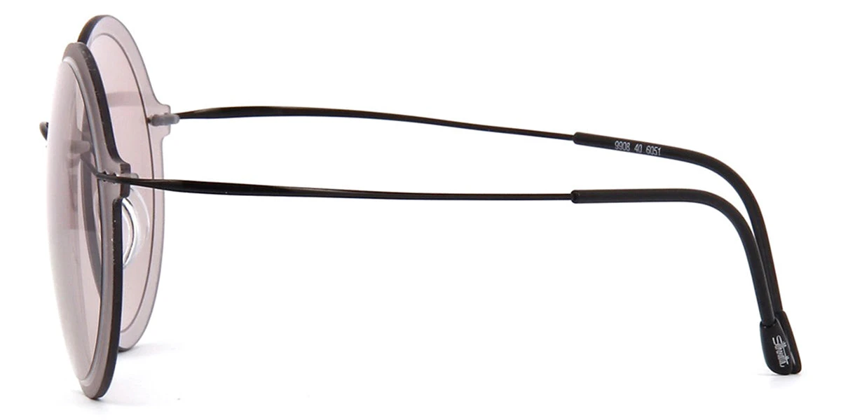 This round Silhouette sunglass comes in a black frame with light pink lenses.