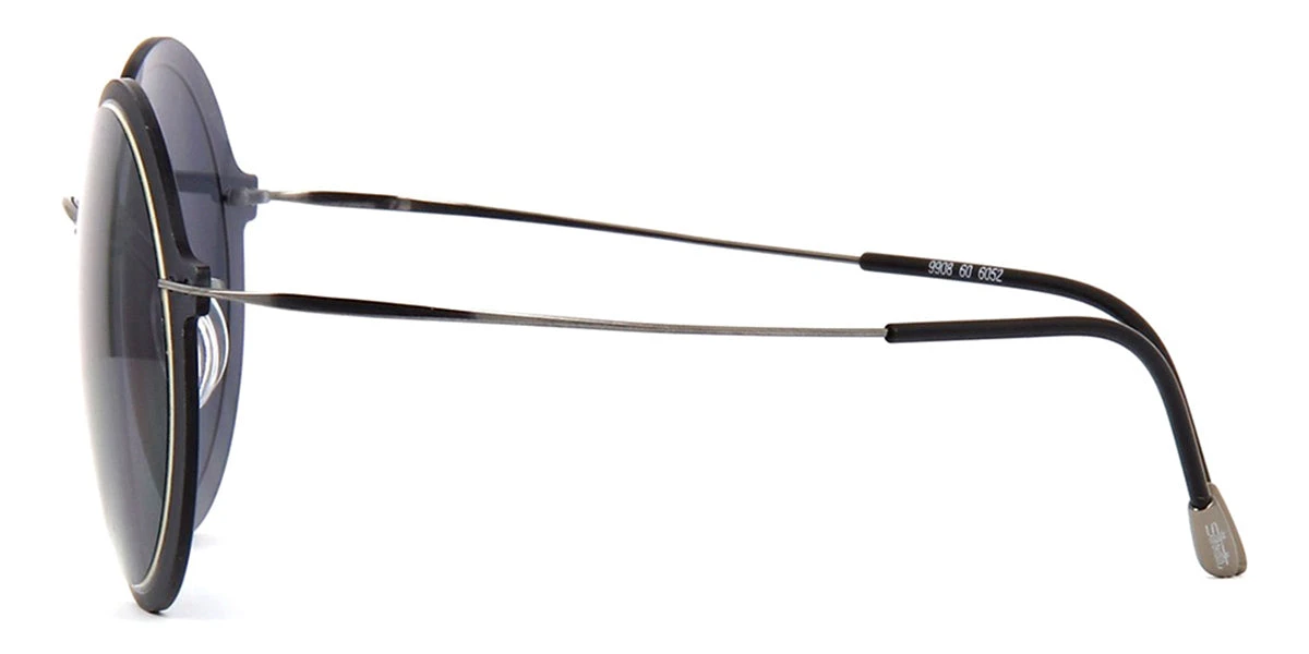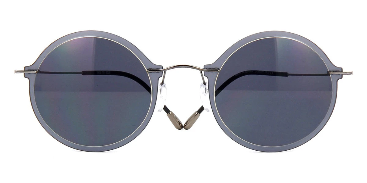 This round Silhouette sunglass comes in a ruthenium frame with blue lenses.