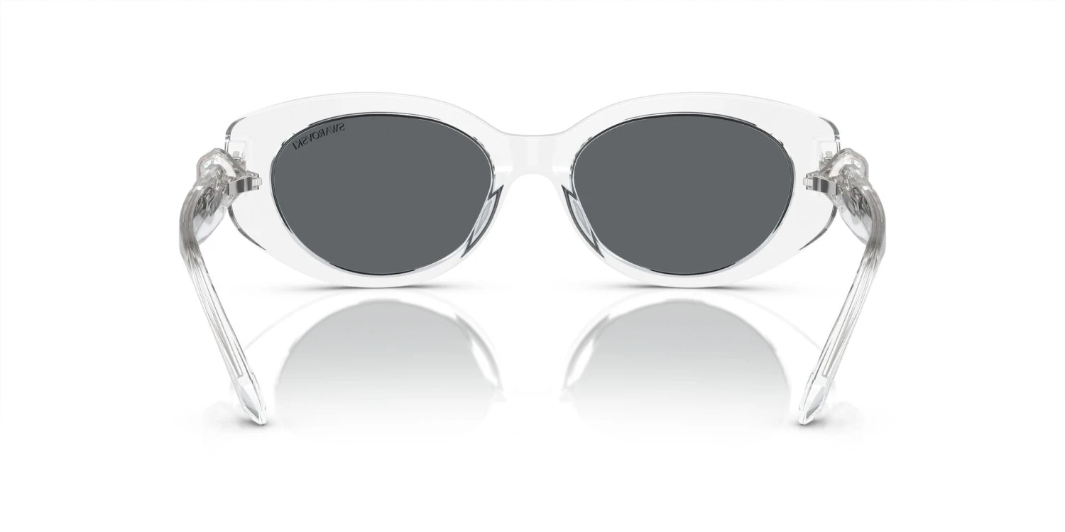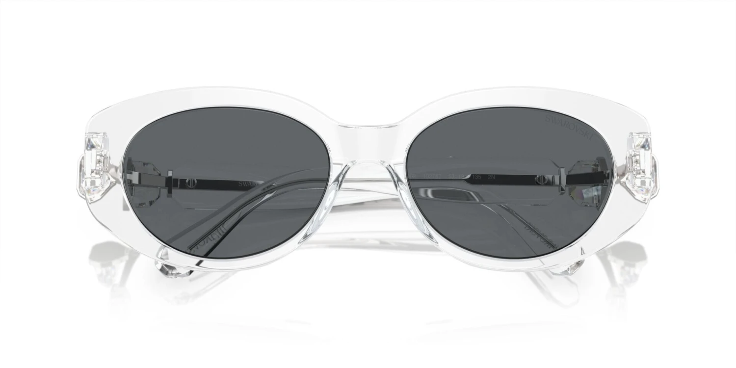 This round Swarovski sunglass comes in a crystal frame with dark grey lenses.
