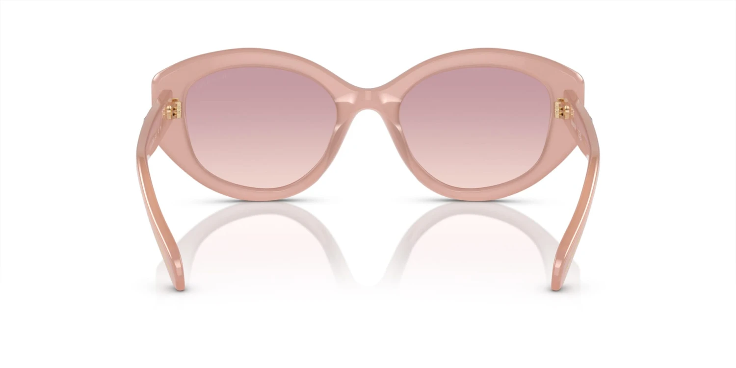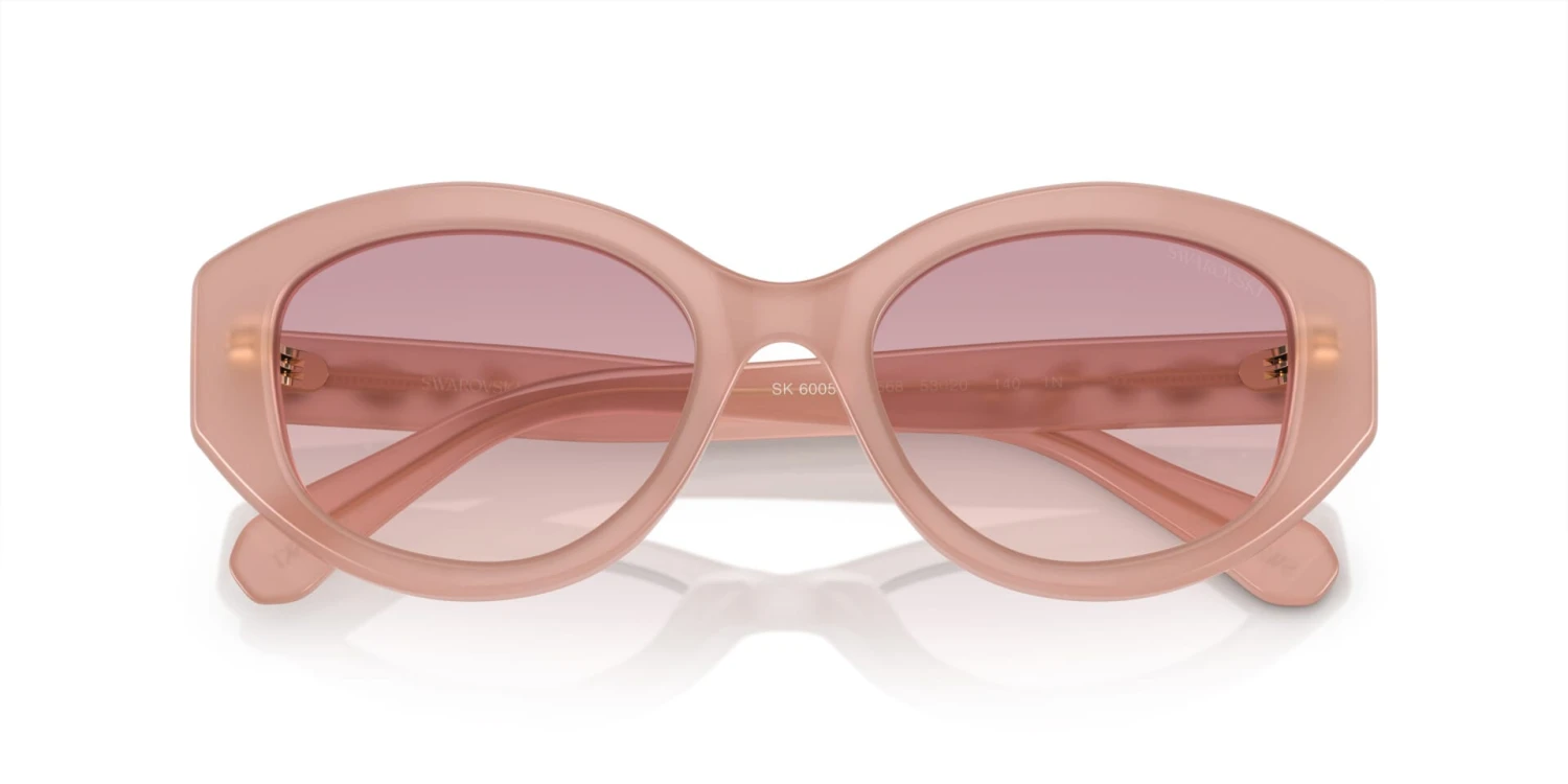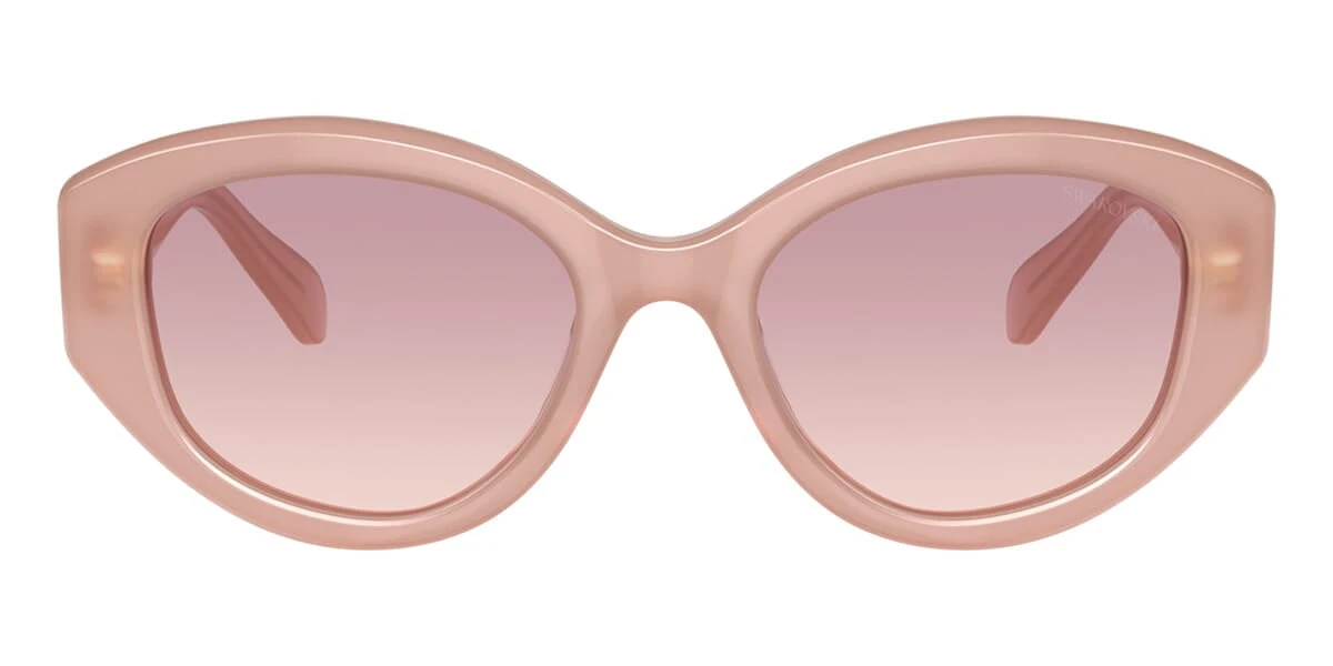 This cat eye Swarovski sunglass comes in a pink opal frame with brown to violet gradient lenses.