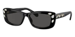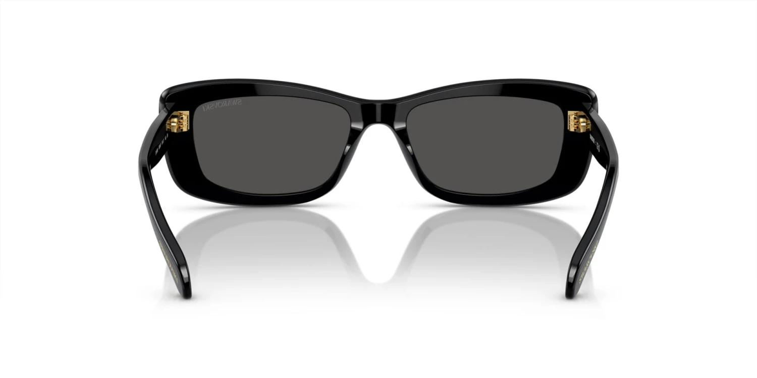 This rectangular Swarovski sunglass comes in a black frame with dark grey lenses.