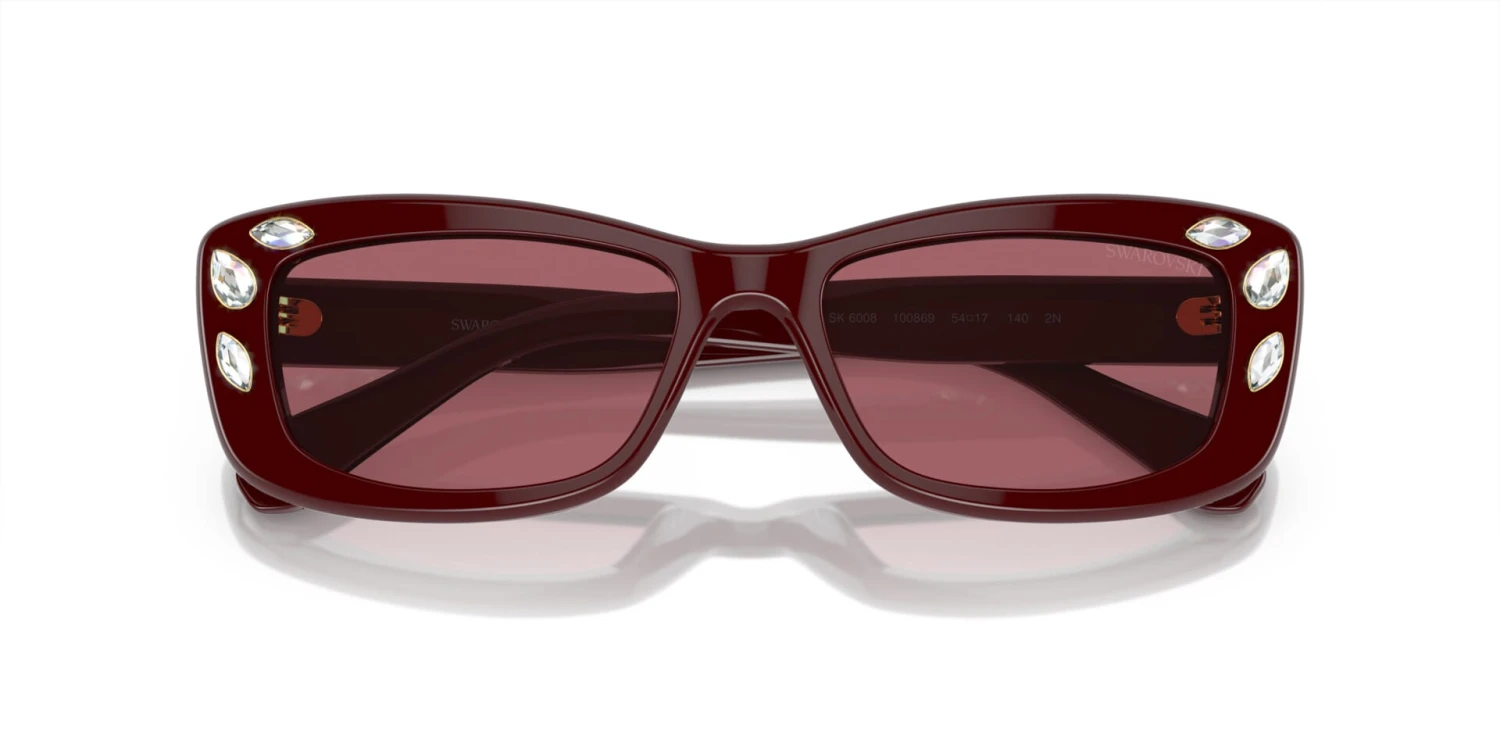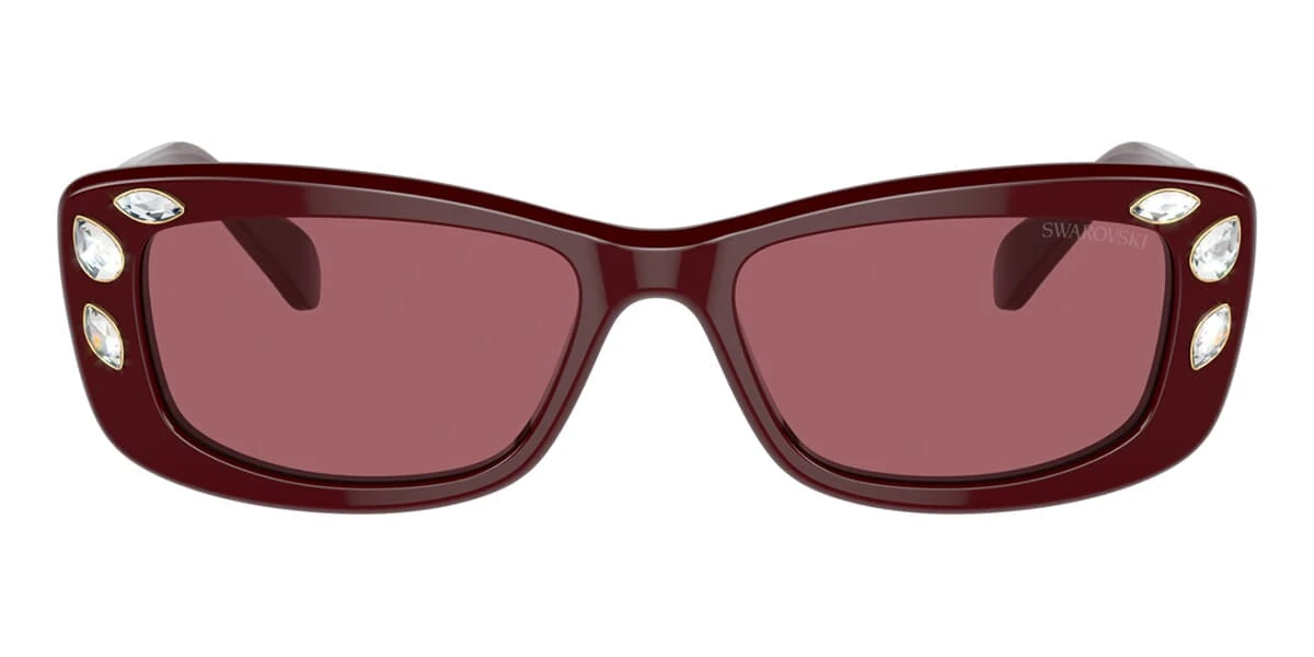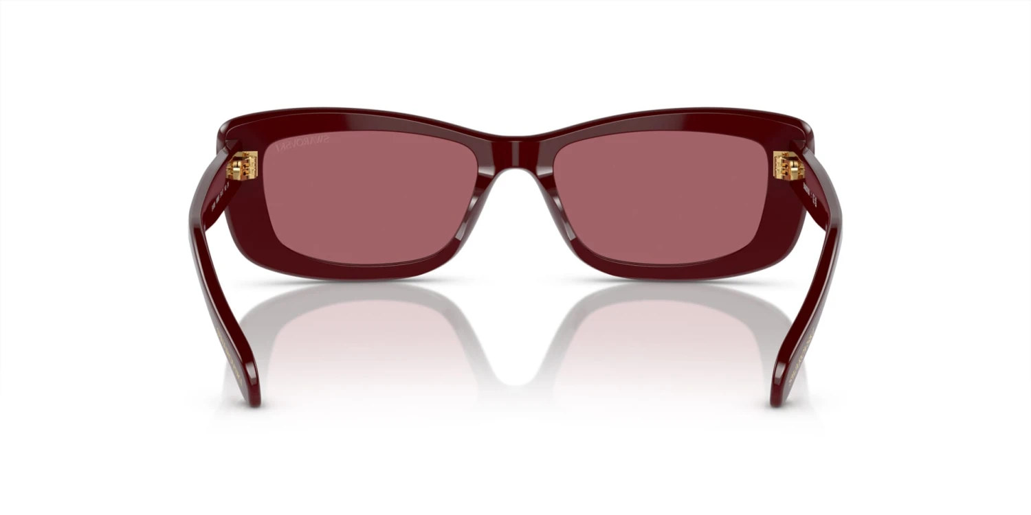 This rectangular Swarovski sunglass comes in a burgundy frame with burgundy lenses.