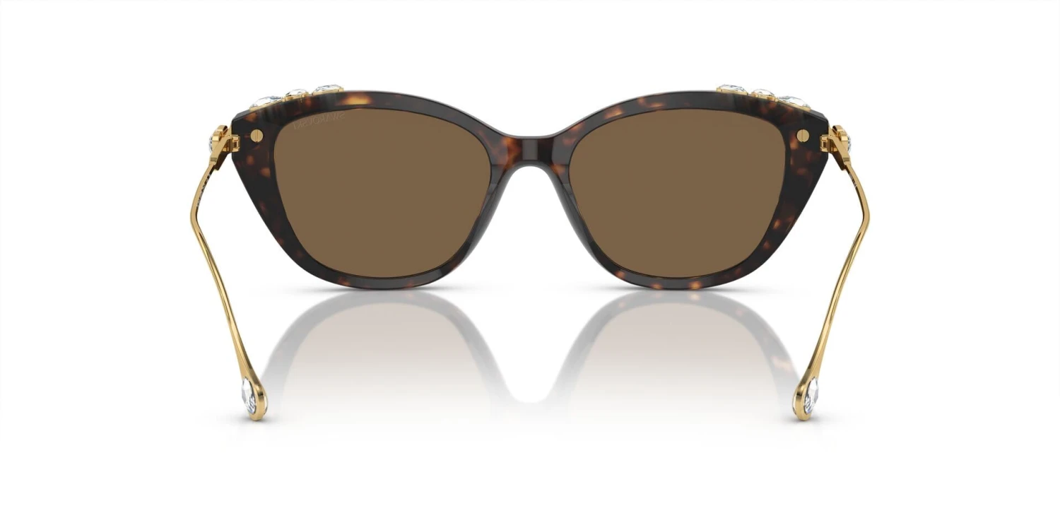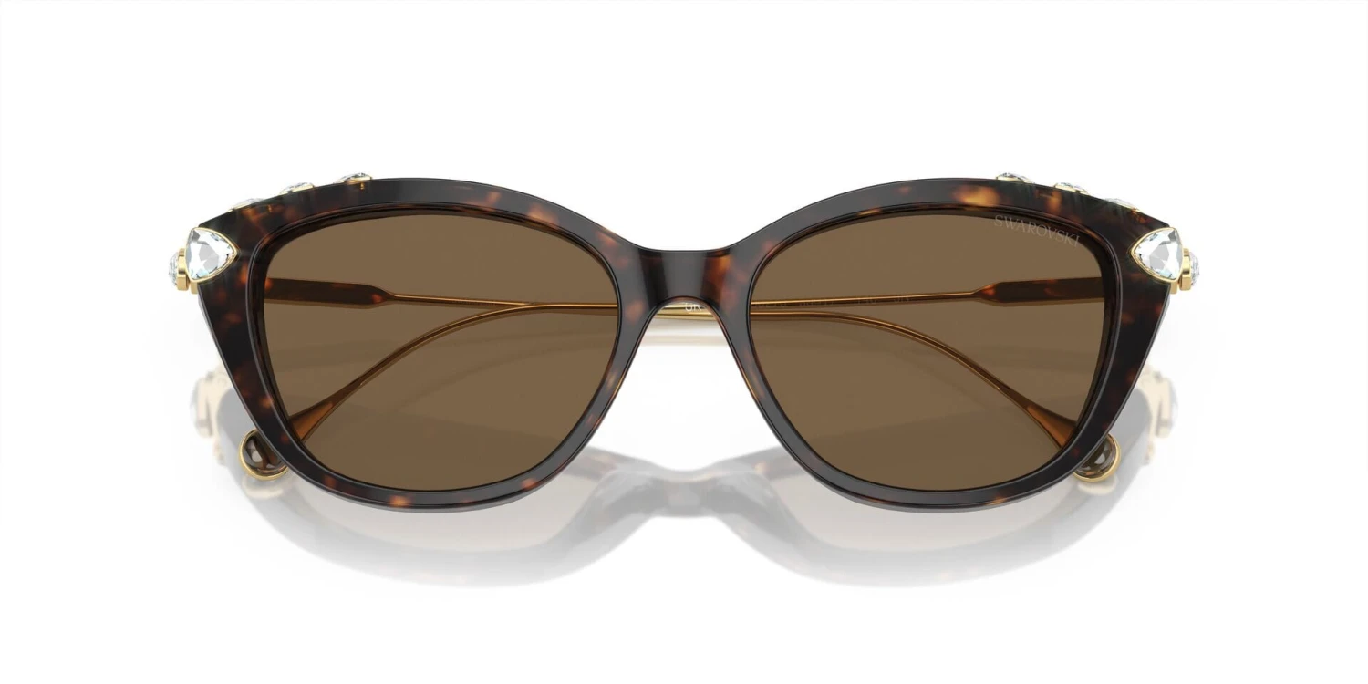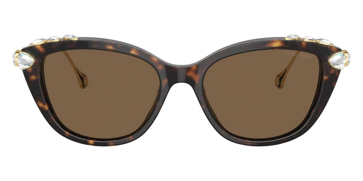 This cat eye Swarovski sunglass comes in a havana frame with dark brown lenses.