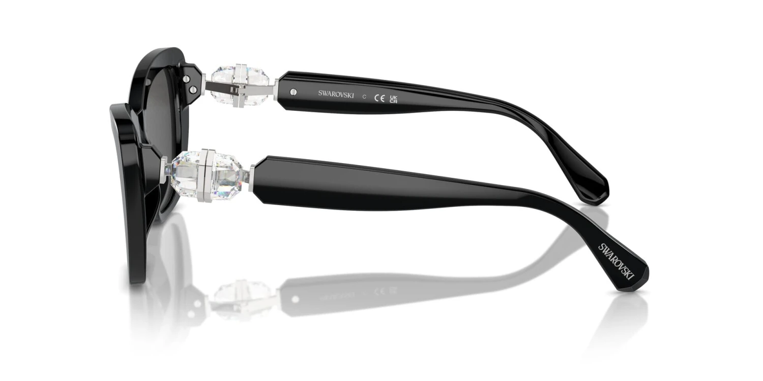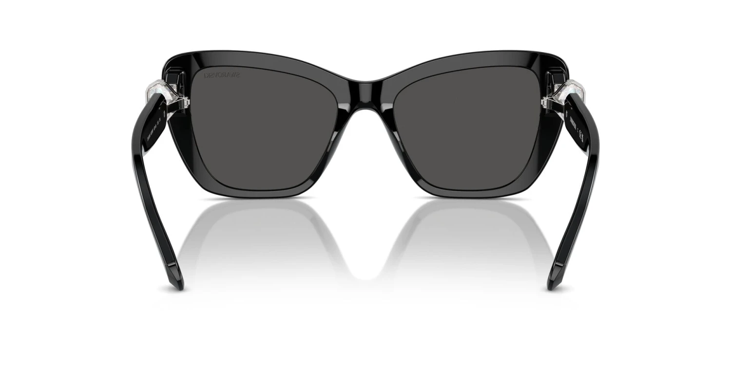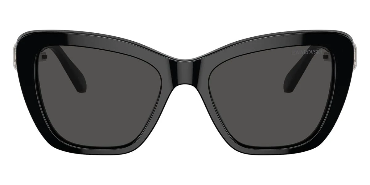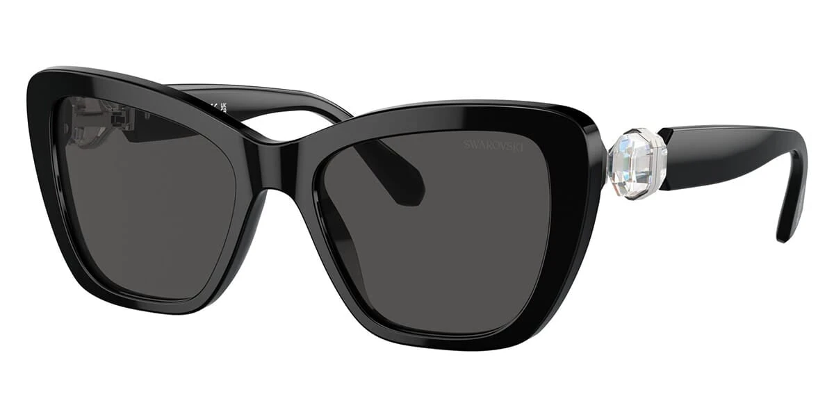 This cat eye Swarovski sunglass comes in a black frame with dark grey lenses.