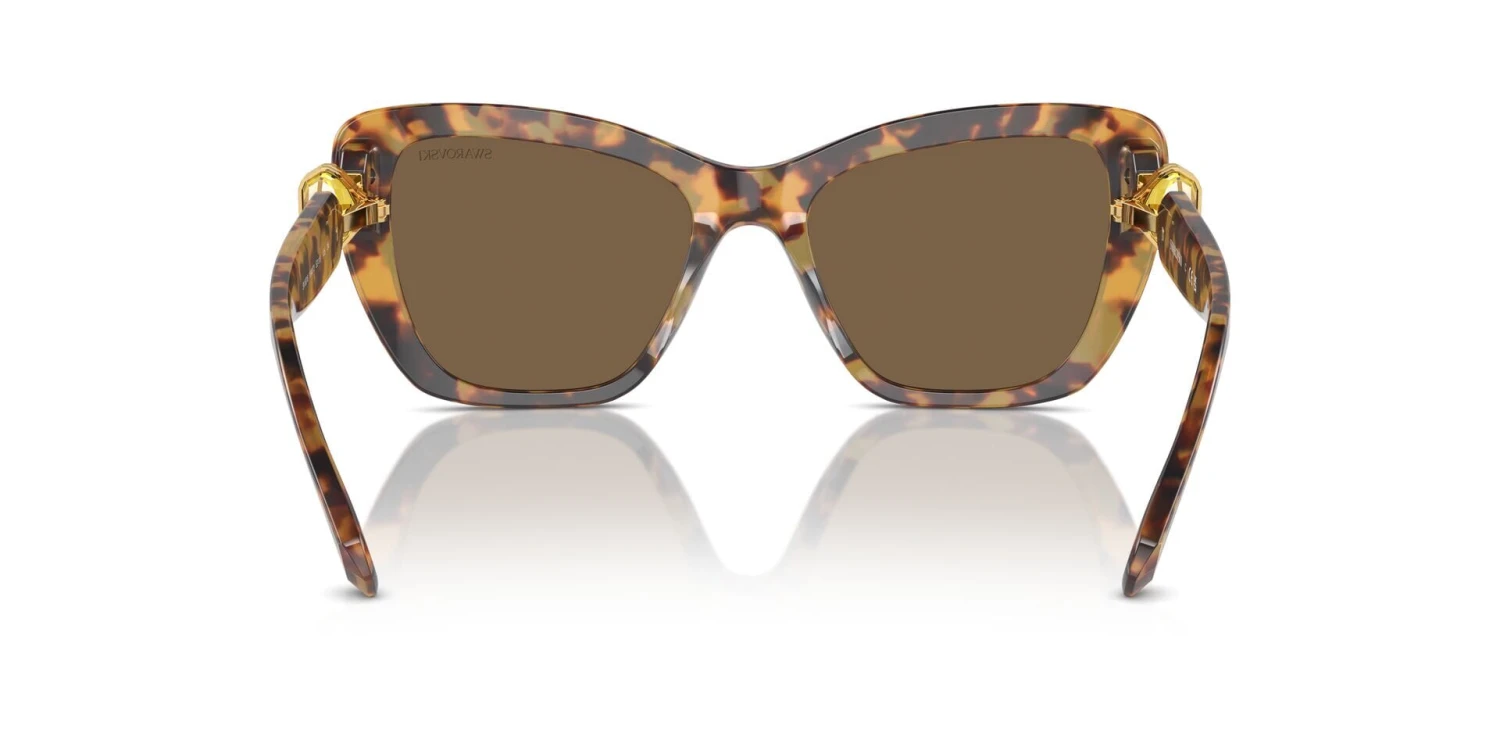 This cat eye Swarovski sunglass comes in a havana media frame with dark brown lenses.