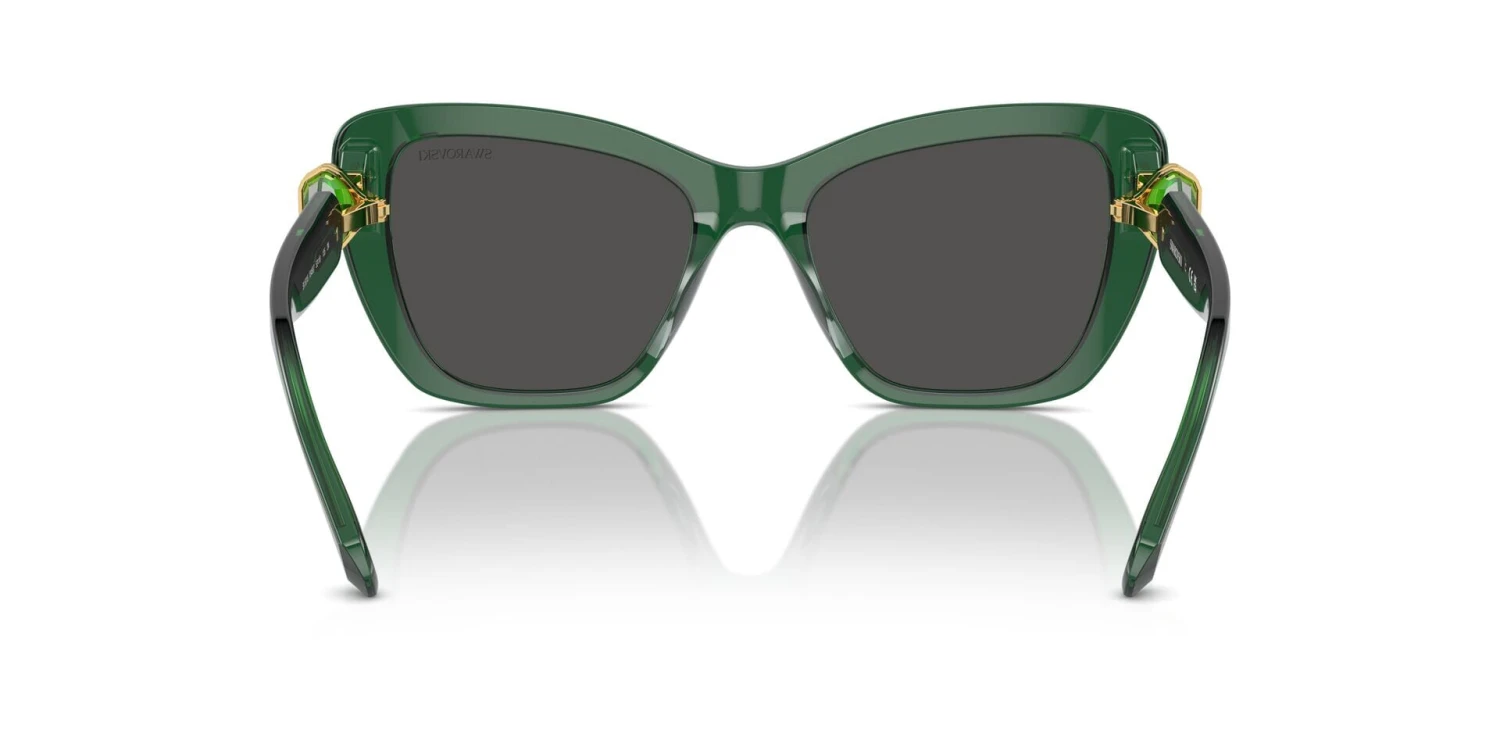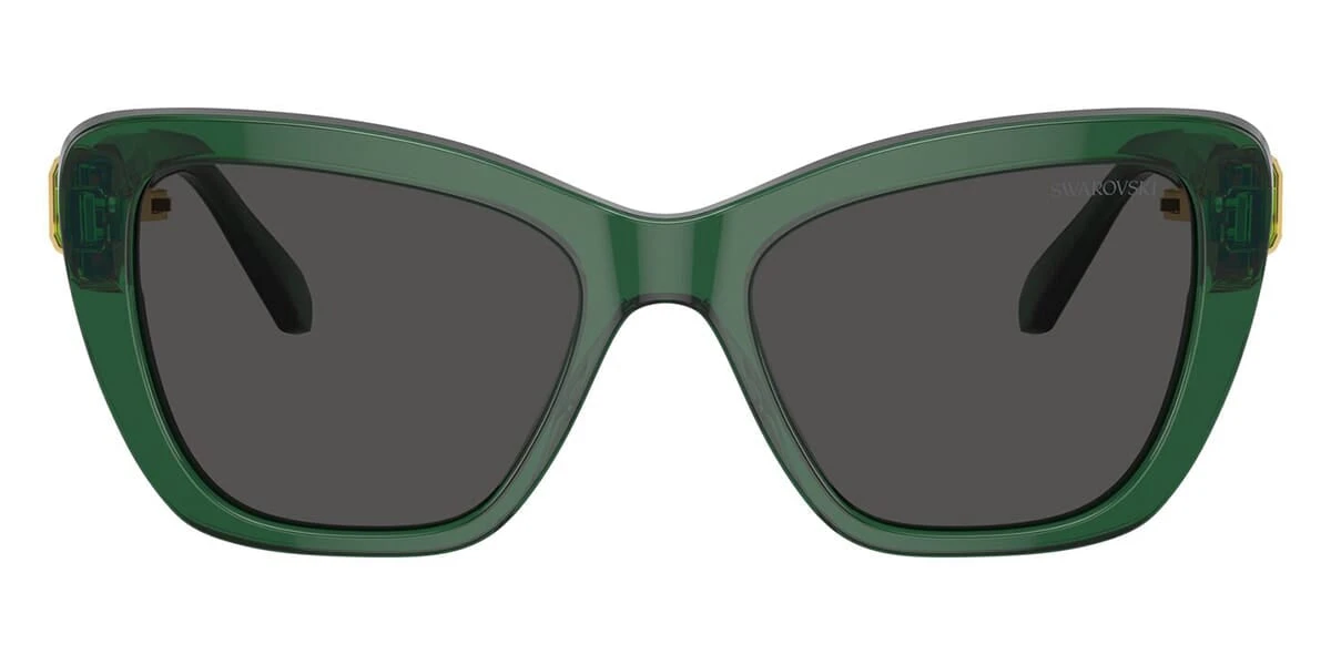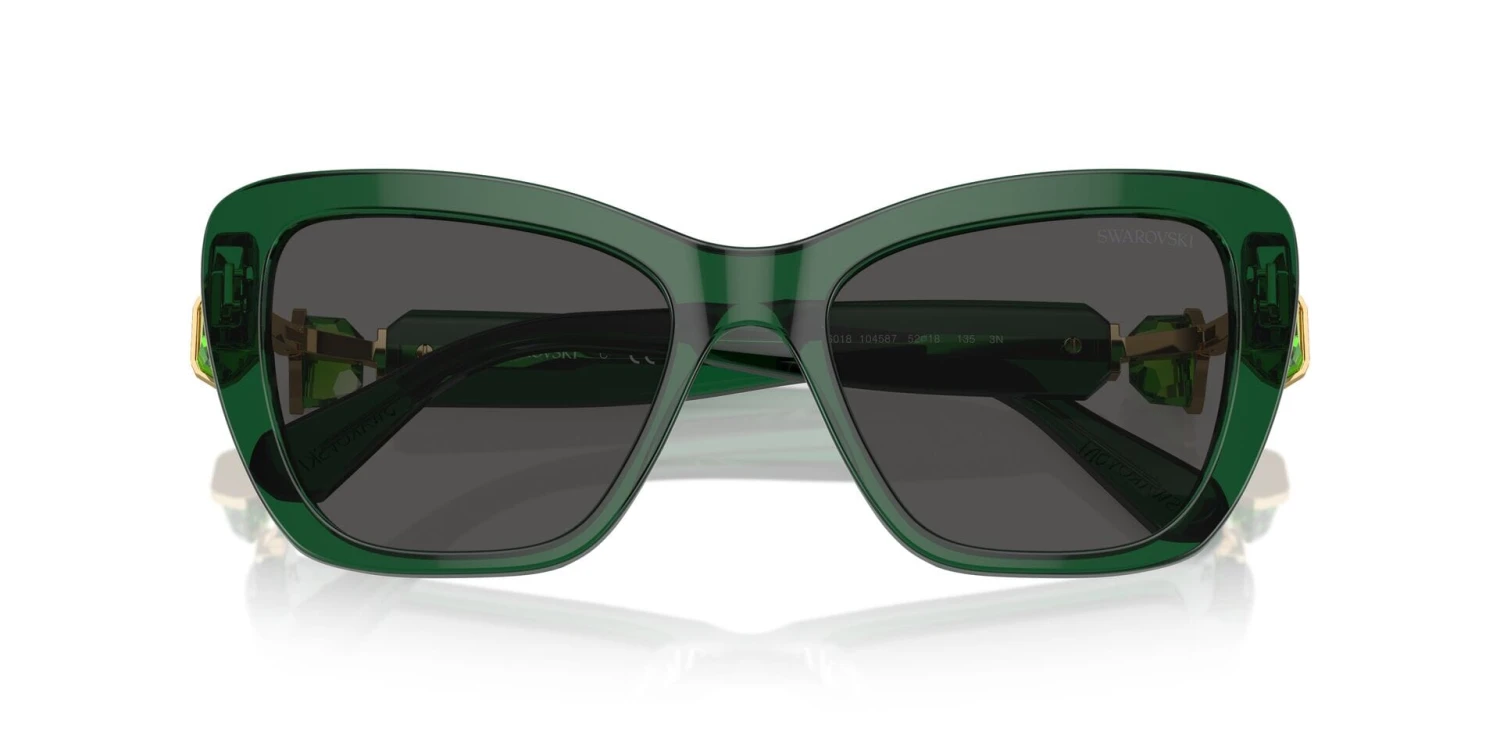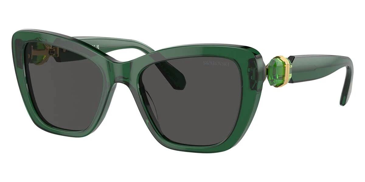 This cat eye Swarovski sunglass comes in a dark green crystal frame with dark grey lenses.