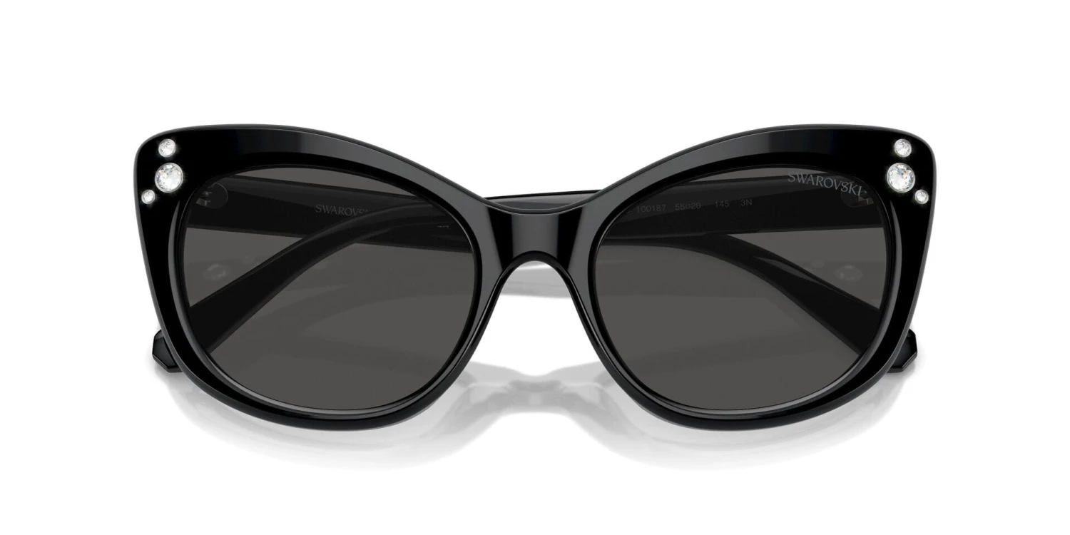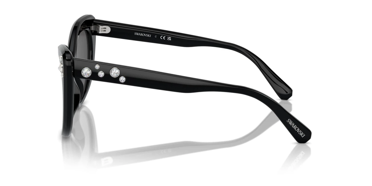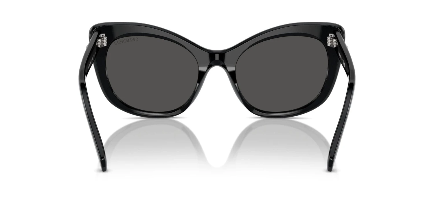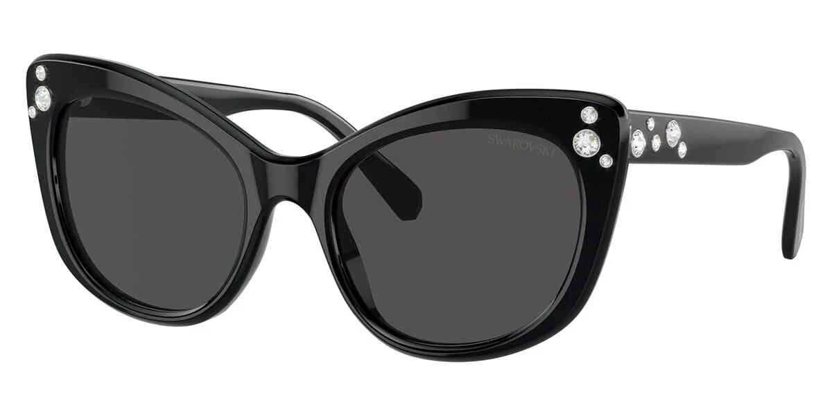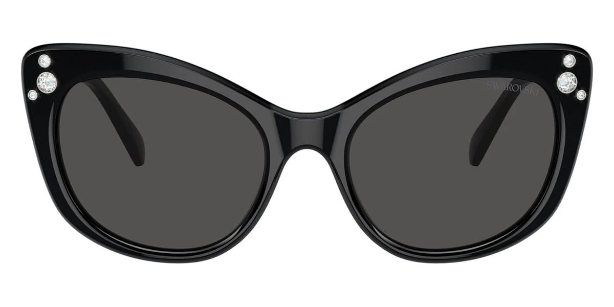 This cat eye Swarovski sunglass comes in a black frame with dark grey lenses.
