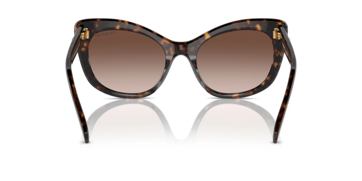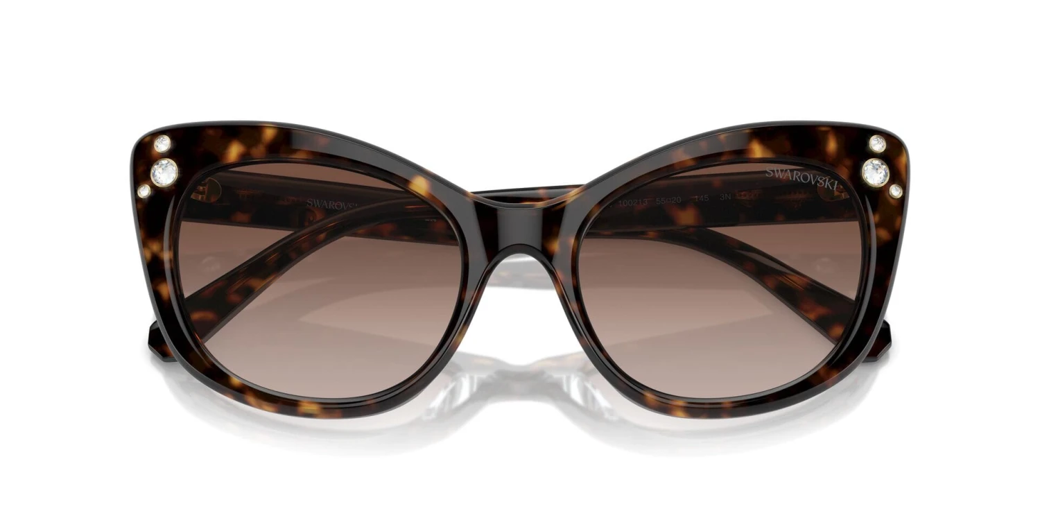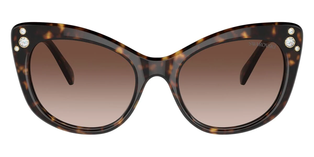 This cat eye Swarovski sunglass comes in a havana frame with brown gradient lenses.