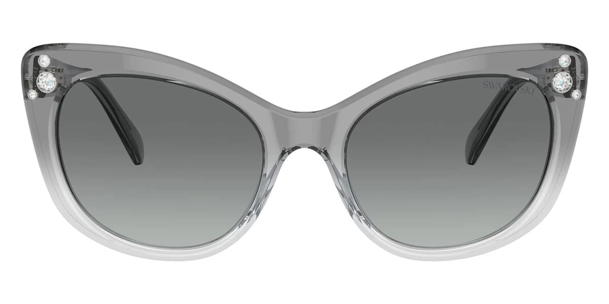 This cat eye Swarovski sunglass comes in a dark grey crystal frame with grey gradient lenses.