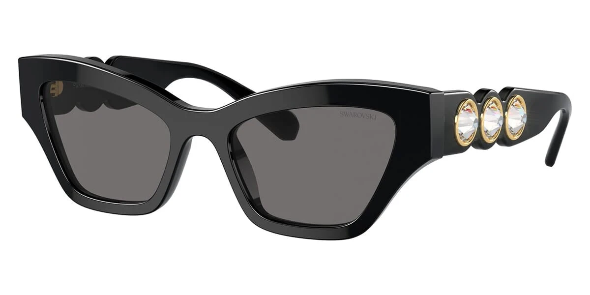 This cat eye Swarovski sunglass comes in a black frame with dark grey polarised lenses.