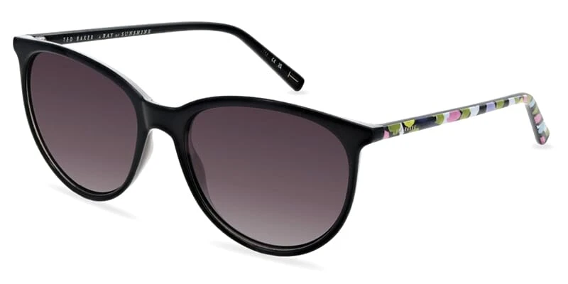 This round Ted Baker sunglass comes in a black frame with grey lenses.