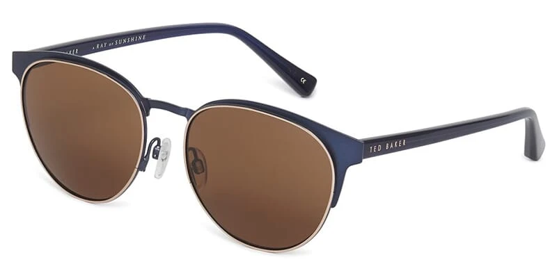 This round Ted Baker sunglass comes in a navy frame with brown lenses.