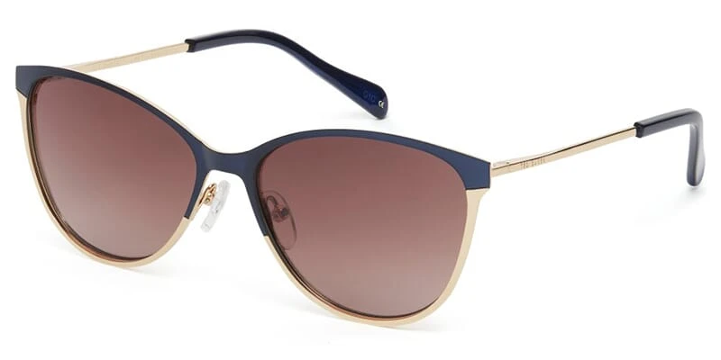 This cat eye Ted Baker sunglass comes in a navy frame with brown lenses.