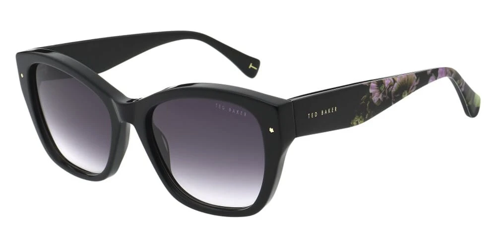 This square Ted Baker sunglass comes in a black frame with grey gradient lenses.