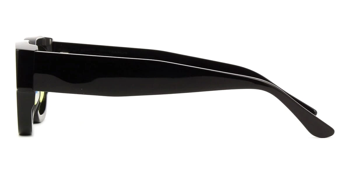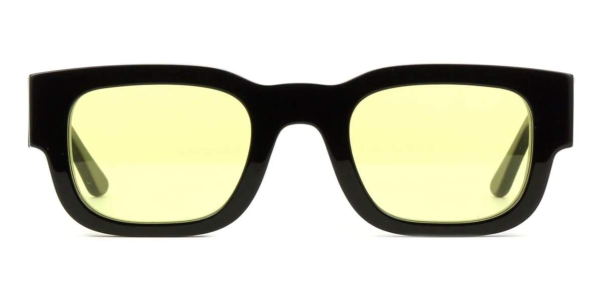 This square Thierry Lasry sunglass comes in a shiny black frame with yellow lenses.